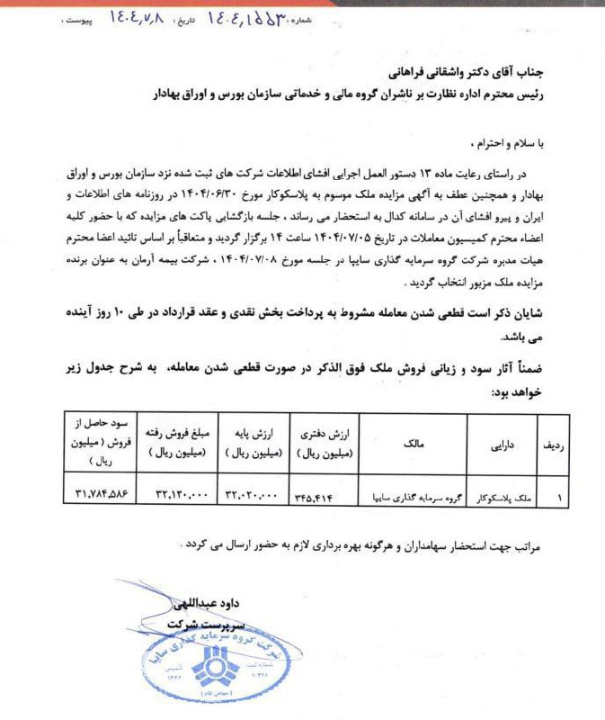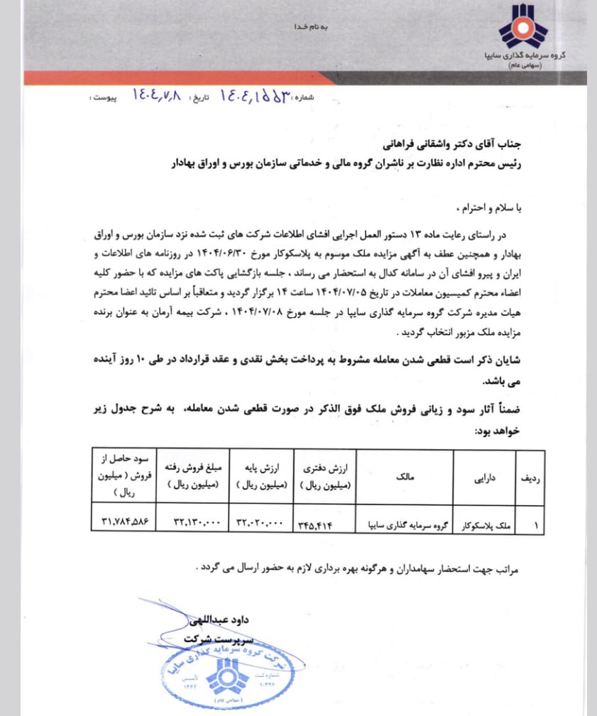 فروش ملک پلاسکوکار به ارزش 3213 میلیارد تومان