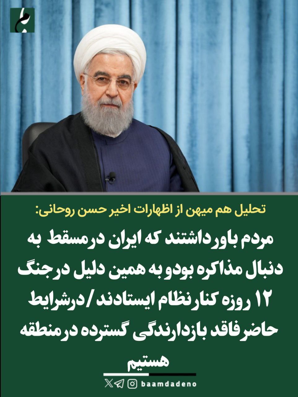 🔴 تحلیل روزنامه هم میهن از اظهارات اخیر حسن روحانی/ مردم باور داشتند که ایران در مسقط دنبال مذاکره بودو به همین دلیل در جنگ ۱۲ روزه کنار نظام ایستادند...