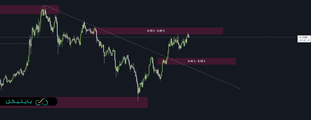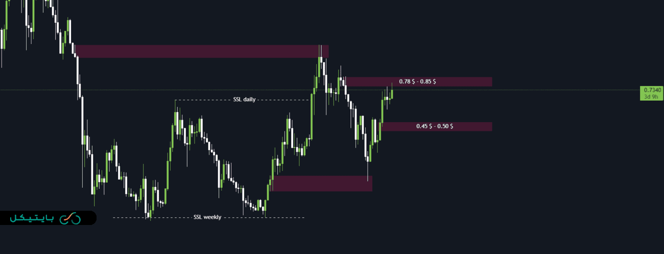در حال حاضر محدوده مدنظر بر اساس شکست ساختار و شکست روند نزولی پرقدرت، همانند چارت هفتگی، محدوده 0.45$ – 0.50$ میباشد. دقت کنیم این محدوده تحت عنوان هدف قیمت در صورت اصلاح است و صرفا به معنای ورود بع معامله خرید در این سطوح نیست.