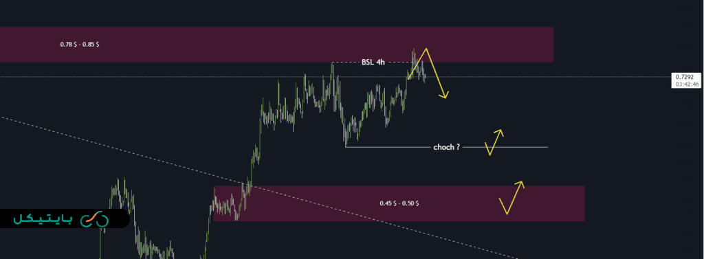 در تایم فریم پایینتر، مانند تایم فریم ۴ ساعته، هدف اصلی ما پس از رسیدن قیمت به محدوده مقاومتی که بین ۰.۷۵ تا ۰.۸۰ دلار قرار دارد، این است که به دنبال نشانهها و تأییدیههایی باشیم که نشان دهند اصلاح قیمت در شرف آغاز است. این اصلاحات به منظور بازگشت قیمت به سطوح حمایتی است که قبلاً در تحلیل به آنها اشاره کردهایم. در واقع، تا زمانی که قیمت بالاتر از محدوده کلیدی “تغییر ساختار” یا همان CHOCH باقی بماند، میتوانیم بگوییم که روند همچنان صعودی است و هنوز هیچ نشانهای از تغییر جهت روند مشاهده نشده است.