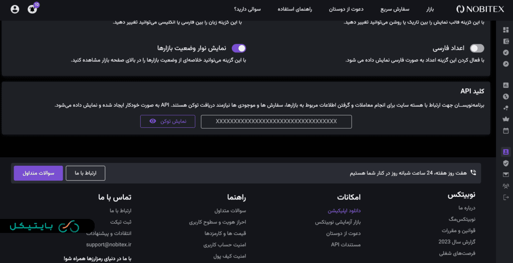 اگر در صرافی نوبیتکس حساب دارید و یا پس از اینکه ثبت نام و احراز هویت خود را تکمیل کردید برای دریافت اشتراک ویژه بایتیکل در قسمت پروفایل و تنظیمات و از قسمت کلید API روی دکمه نمایش توکن کلیک کنید و آن را کپی کنید.