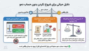 مدیریت احساسات (تا حدودی): اگرچه ترس از دست دادن پول واقعی وجود ندارد، اما تمرین انضباط در ورود و خروج طبق استراتژی، عادتی است که باید در حساب دمو ساخته شود.