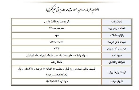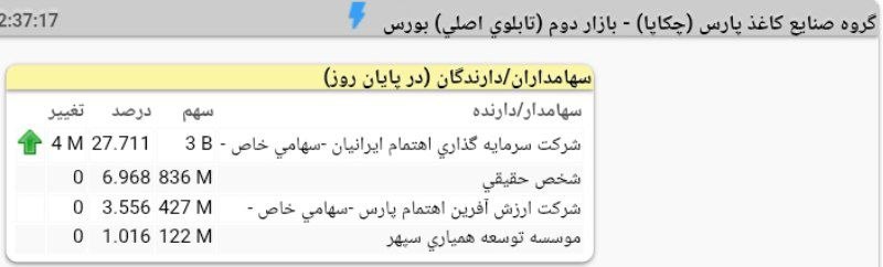 ✅ عرضه بلوک 7.25 درصدی سهام مدیریتی غیر کنترلی شرکت گروه صنایع کاغذ پارس در بازار دوم بورس تهران به گزارش بورس 24، بلوک 7.25 درصدی سهام شرکت گروه صن...