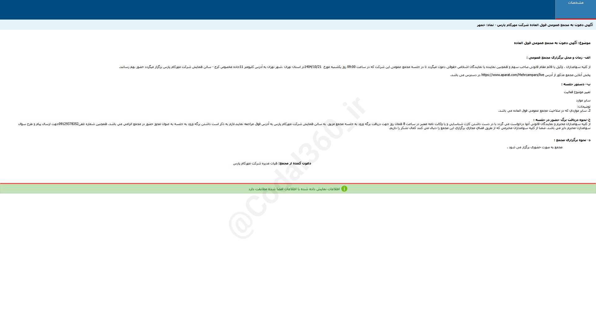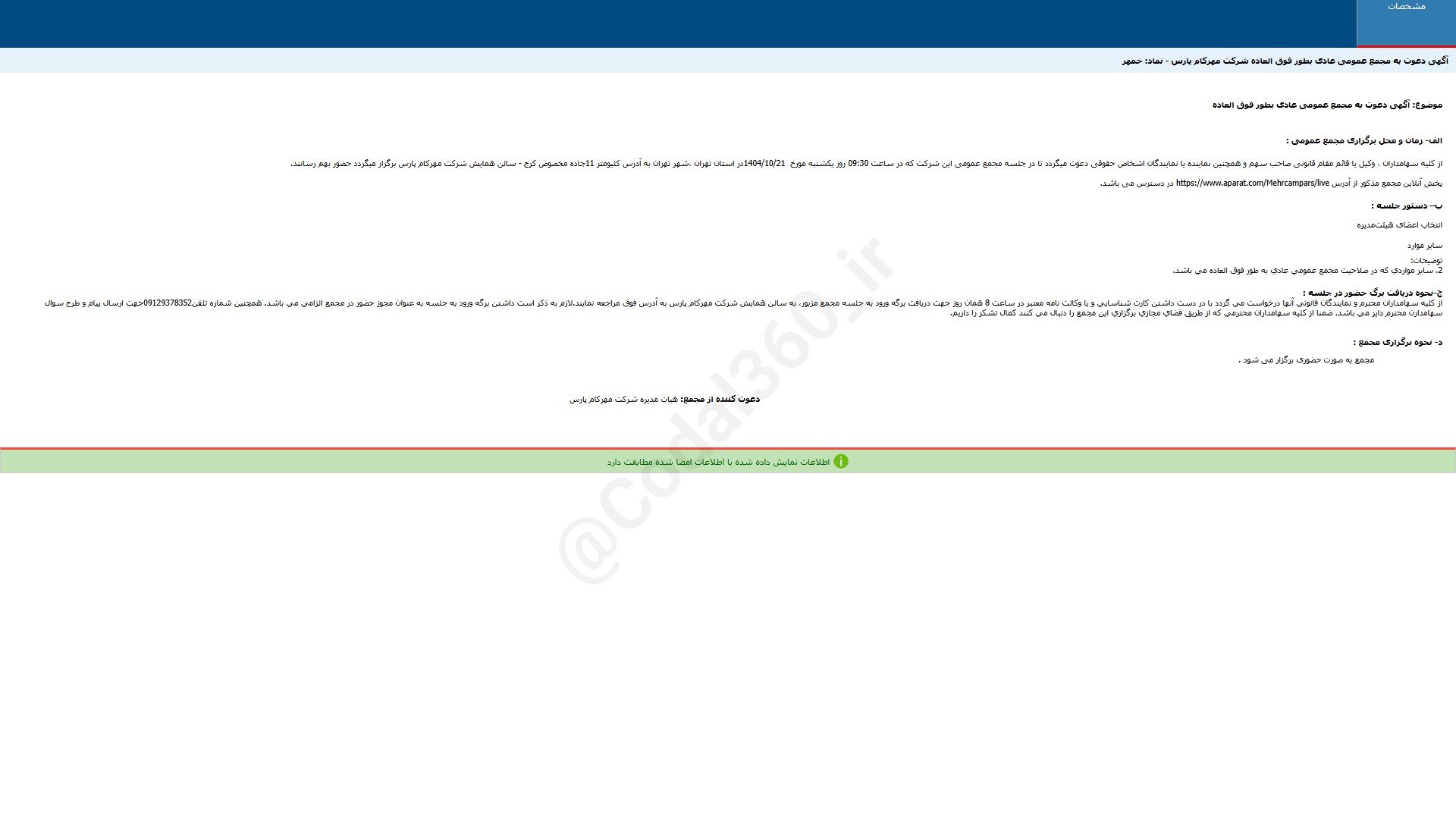 #خمهر آگهی دعوت به مجمع عمومی عادی بطور فوق العاده شرکت مهرکام پارس...