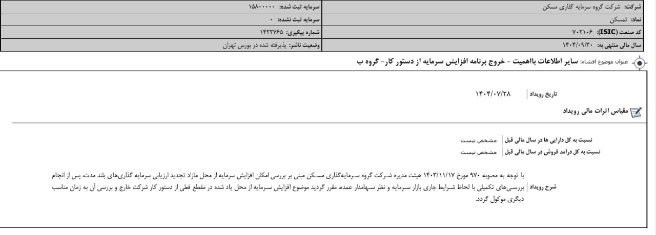 🟠هیئت مدیره #ثمسکن اعلام کرد افزایش سرمایه از محل تجدید ارزیابی فعل...