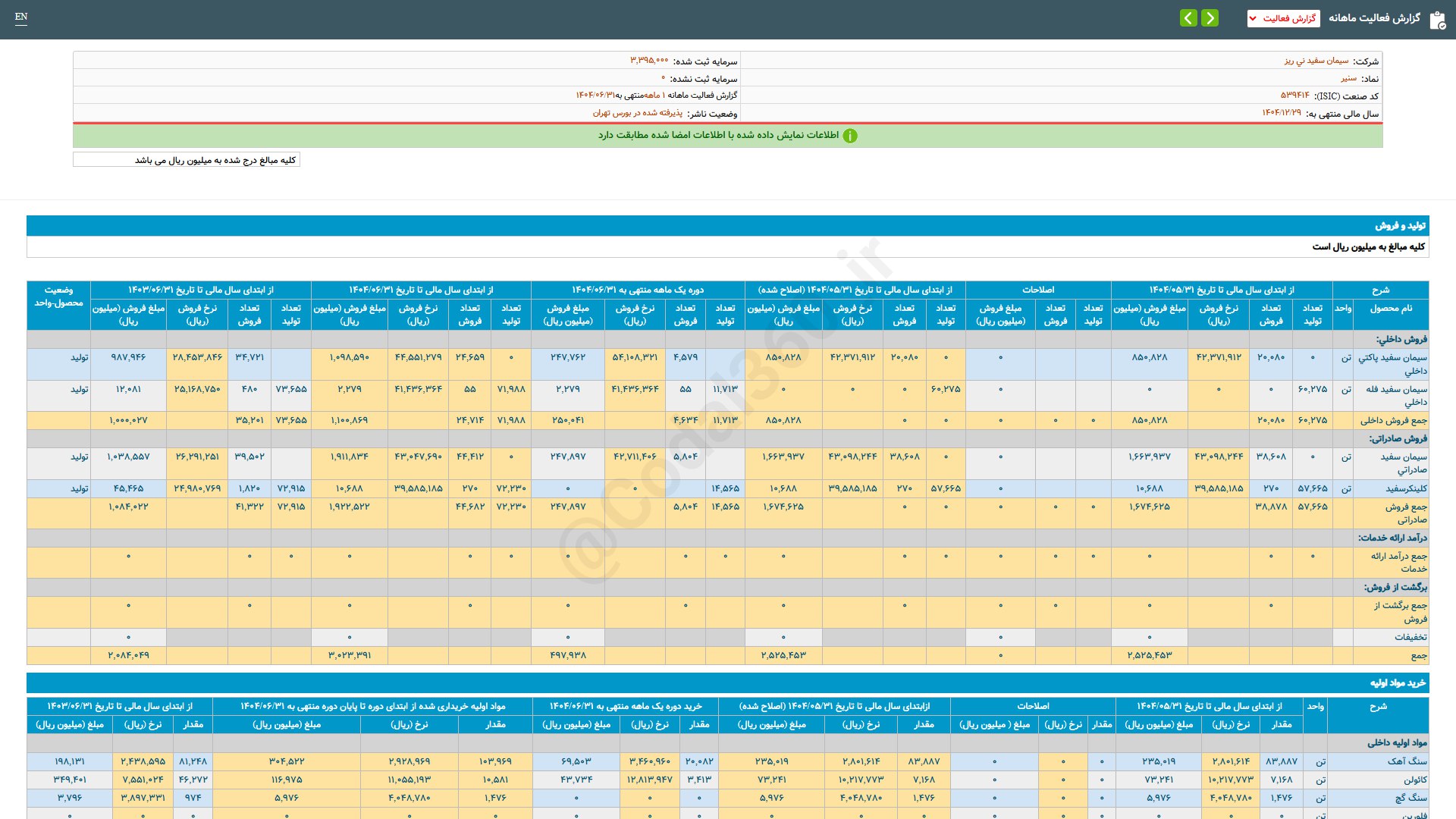 #سنیر #گزارش فروش اردیبهشت ماه 1404 ✅ سیمان سفید نیریز (